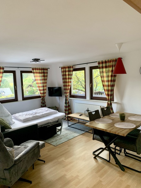 Im Wohnzimmer befindet sich ein großes Schlafsofa (150x200cm), welches mit einem Handgriff ein- und ausgeklappt werden kann. Ein SmartTV steht ebenfalls zur Verfügung.