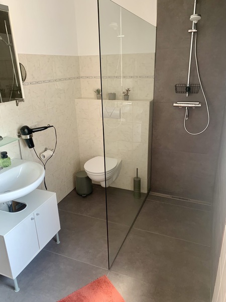 Das Badezimmer wurde mit einer neuen großen barrierefreien Dusche erneuert.